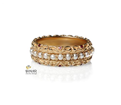Dinarjewelry Eternity Natural White Pearls And Rubies Antique Vintage Style Engraved Scrolls Leafs 14k 18k Solid Gold Ring From Amazon Shefinds Diamond Wedding Rings Sydney